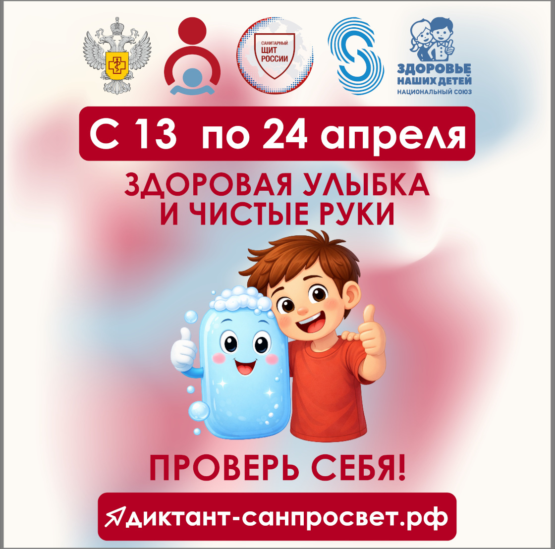 24.04.2026Обучающиеся и педагоги нашей школы приняли участие во Всероссийской акции «Диктант здоровья», которая проходит с 13 по 24 апреля 2026 года. Тема этого года — «Здоровая улыбка и чистые руки», что особенно актуально для формирования полезных гигиенических навыков.Ребята с большим удовольствием проверили свои знания о правильной гигиене полости рта и важности мытья рук. По итогам диктанта все участники получили именные сертификаты. Такие акции формируют у детей осознанность в вопросах заботы о своём здоровье и прививают полезные привычки с юных лет.Благодарим всех, кто проявил активность и интерес к «Диктанту здоровья».