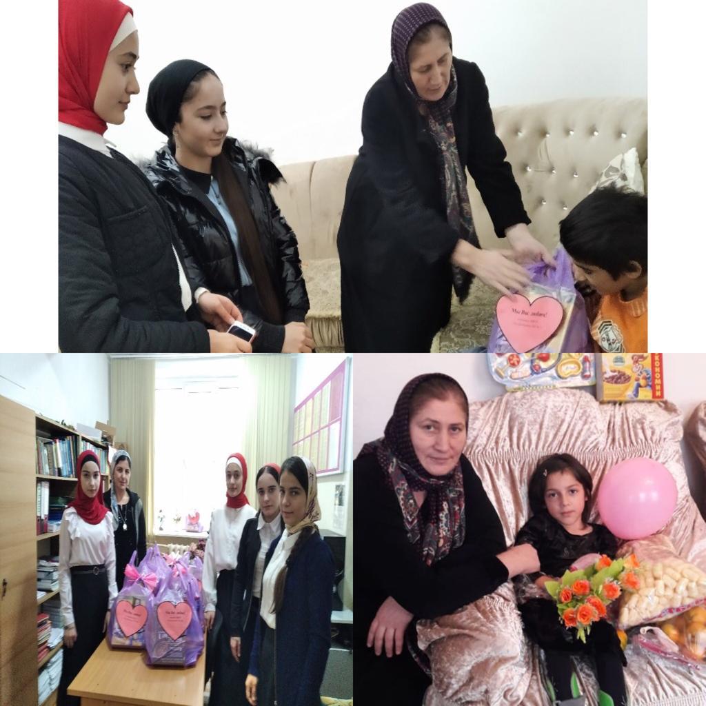В нашей школе учатся 6 мальчиков и 5 девочек, с ограниченными возможностями. Для них были приготовлены подарки, которые им вручили зам. директора по ВР Темиралиева Л.У., лидер ЕДЮО Джанаева Р.Ш., член ЕДЮО Исмаилова И. и соцпедагог Алиева М.Ш. Работать с детьми-инвалидами трудно, но интересно. Дети-инвалиды - это особые дети. Учителя, работающие в школе, не забывают, что все люди независимо от состояния здоровья, рождаются свободными и равными в своих правах, в своем достоинстве и ценности своей личности.