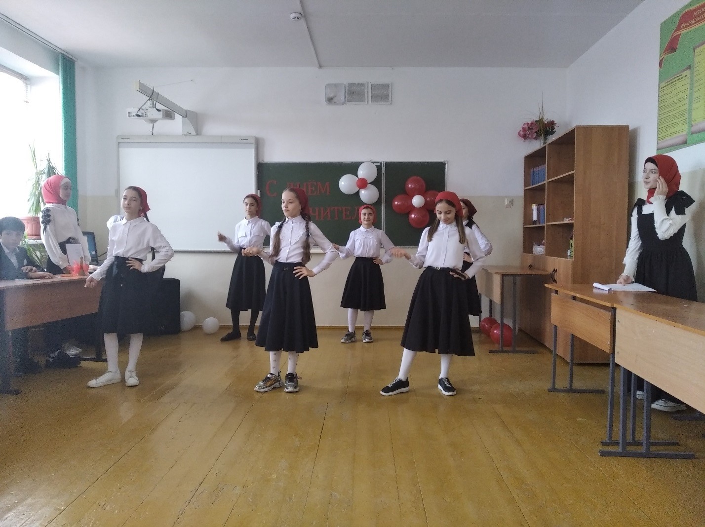 В конце праздничного дня в прошел концерт. Заранее был украшен класс. Ответственным за это мероприятие были девочки из 10 класса. Под звуки музыки, ведущие начали свое выступление. Было сказано много хороших слов о представителях учительской профессии.
