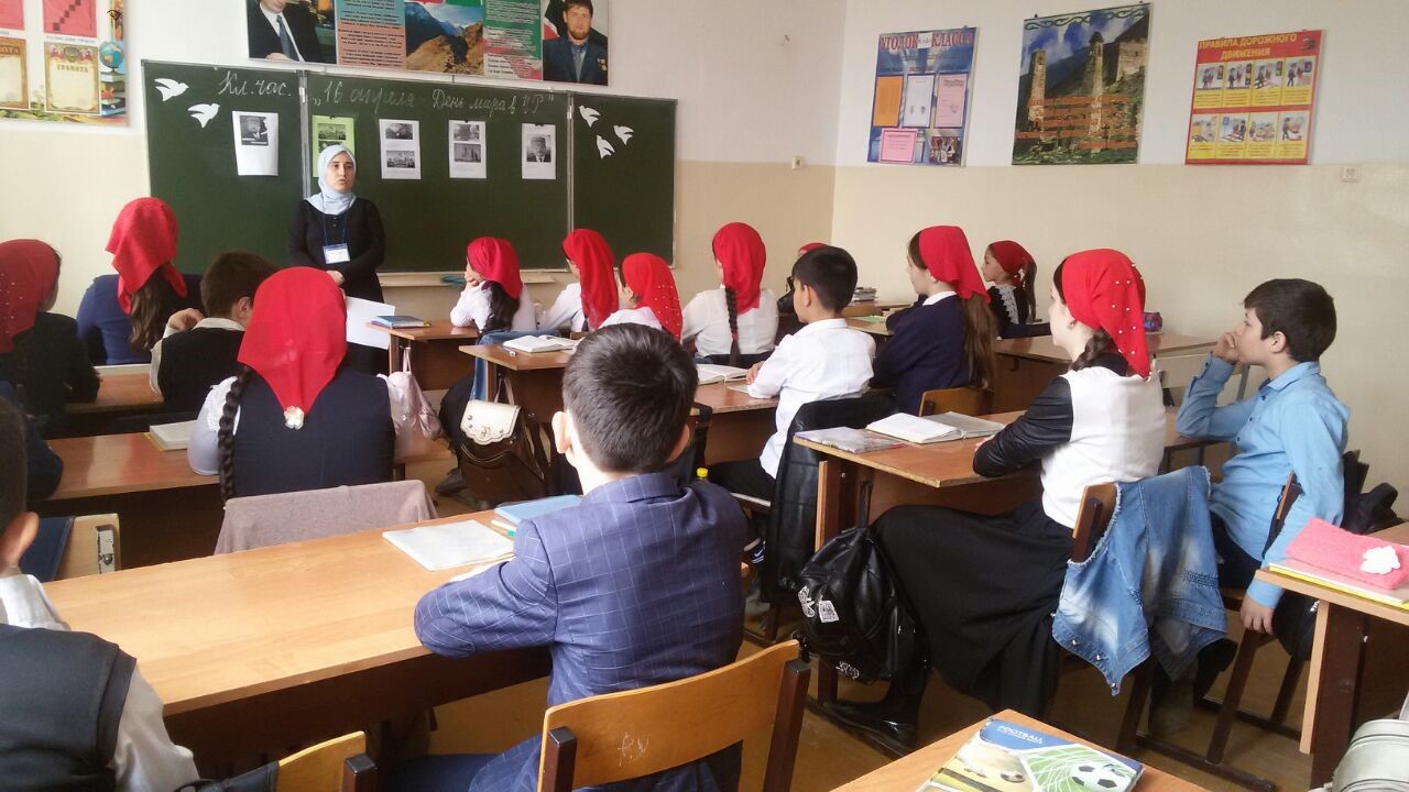 - Классные руководители проводили классные часы и беседы, посвященные Дню мира и раскрывающие положительные изменения в жизни Республики, обусловленные переходом к мирной жизни и связанные с деятельностью Главы ЧР Р.А.Кадырова и его команды. Они рассказали ребятам хронологию событий тех лет, которые способствовали возвращению жизни в Чечне в мирное русло. «Все, что происходило в годы военных кампаний на территории Чечни, сравнимо с хаосом, когда жизнь человека перестала нести какую-либо ценность. Сейчас мы живем в благополучном, стремительно развивающемся регионе огромной страны, вы постигаете жизнь, от вас зависит наше будущее. Поэтому особенно важно знать прошлое своего народа, анализировать историю, чтобы ошибки не повторялись, а Родина только крепла.