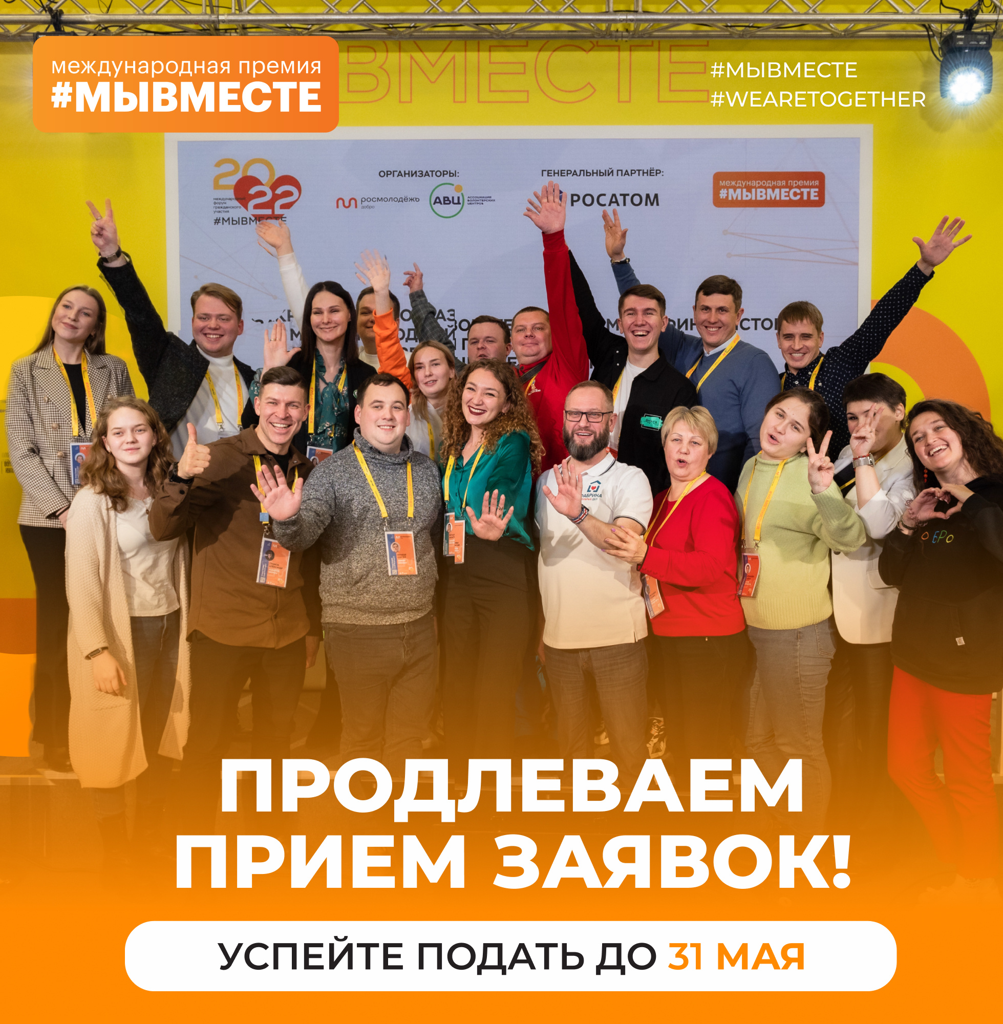 Международная премия #МЫВМЕСТЕ учреждена Федеральным агентством по делам молодежи по поручению Президента России Владимира Путина для того, чтобы выявлять и вдохновлять лидеров положительных социальных изменений из всех регионов России. Благодаря Премии признание и поддержку ежегодно получают проекты в сфере волонтерства и благотворительности, программы корпоративной ответственности и устойчивого развития, информационные и медиапроекты, практики социального партнерства, направленные на конкретную помощь людям и улучшение качества жизни в России и мире.