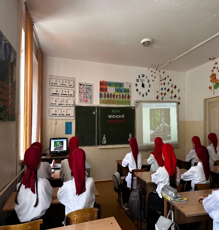 Согласно плану воспитательной работы, в целях формирования нравственной культуры учащихся, воспитания бережного отношения, заботы и чувства ответственности, воспитания уважения и любви к матери, женщине, привития уважения и любви к уникальным и богатым традициям и обычаям вайнахов, в школе ко Дню чеченской женщины в период с 09 по 13.09.2024 г. прошел ряд следующих мероприятий: