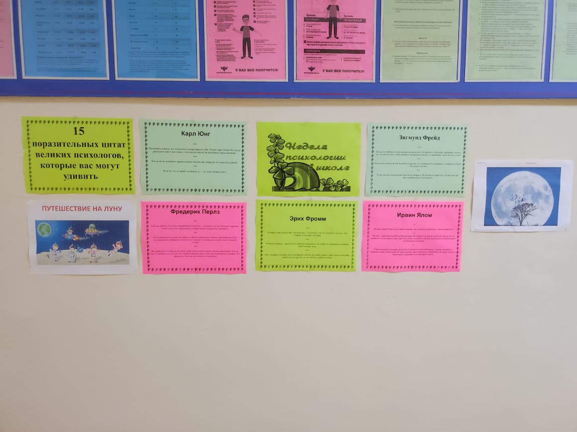 19.11.2025В период проведения Недели психологии с целью создание условий для укрепления, поддержания психологического здоровья учащихся и педагогического коллектива, в коридорах и на лестничных пролетах школы были размещены высказывания психологов, тематические стенгазеты и информация о конкурсах и датах их проведения, материалы к проведению общешкольных мероприятий