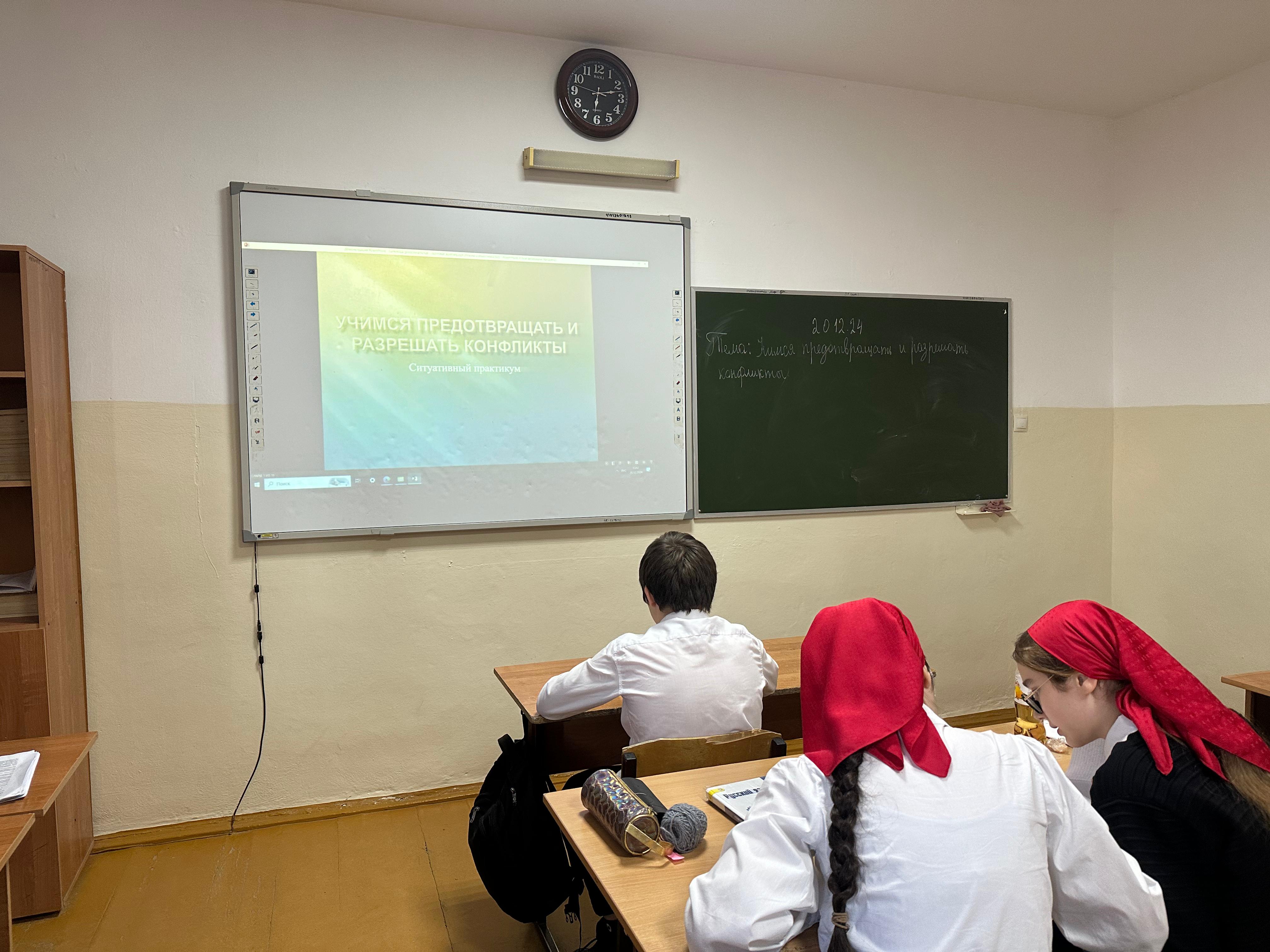 29.11.202429.11.2024г социальным педагогом школы Джавтаевой З.А. был проведен ситуативный практикум «Учимся предотвращать конфликты» с учащимися 7-х классов. В ходе практикума ребята учились находить пути решения различных конфликтных ситуаций и способов избегания конфликтов.